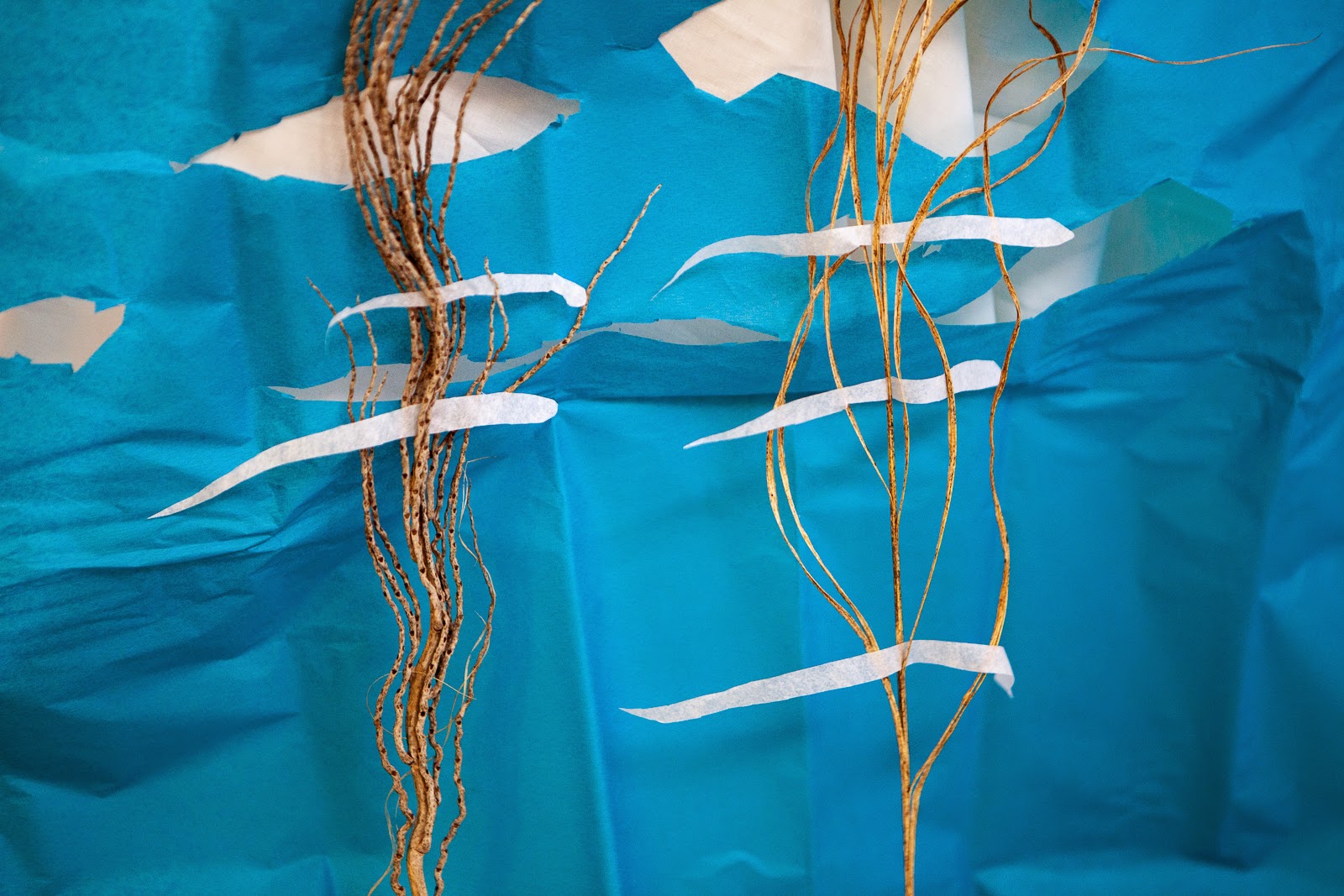 hand – modeling clay, paper and pencils, charcoal, tissue paper, sculpting “sand”,